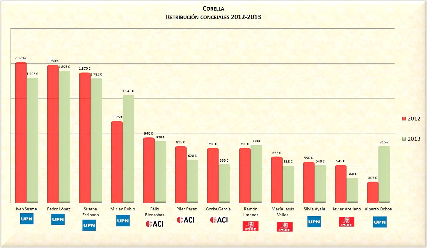 En este otro gráfico podéis ver la diferencia de dinero cobrado por los concejales/as en 2012 con respecto a 2013.