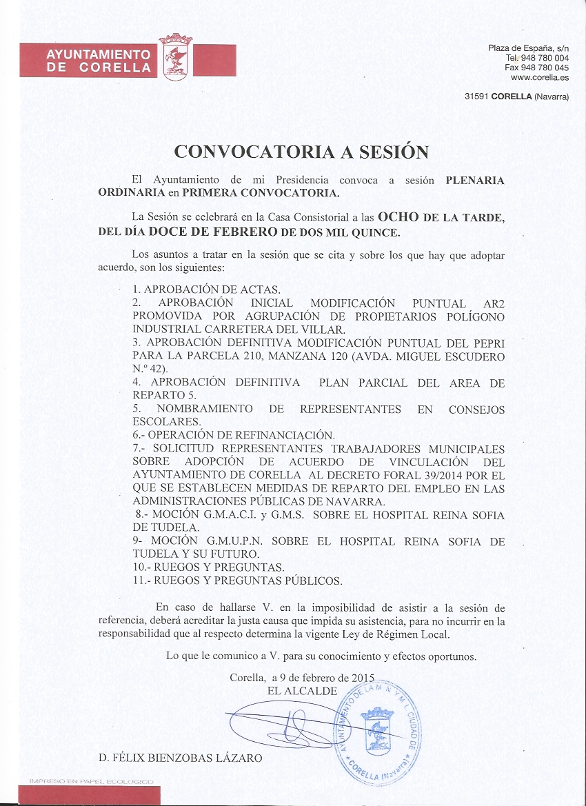 Pleno Ordinario jueves 12 de febrero