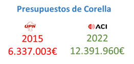 Y algunos datos económicos del Ayuntamiento de Corella son los siguientes. El presupuesto en estos 8 últimos años se ha duplicado. La deuda que tenía el Ayuntamiento se ha reducido a la mitad. El remanente de tesorería (dinero ahorrado en el banco para gastos extraordinarios, que es lo que exige la Ley de estabilidad presupuestaria ) casi se ha duplicado. Y todo esto además, sin pedir un solo crédito en 8 años.