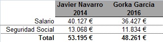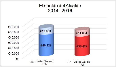 Y en el caso del Alcalde Gorka García, ha sido (con Seguridad Social incluida) de 48.261€ 53.195€, frente a los cobrado en 2014 por alcalde Dº Javier Navarro de 53.195€. Un 9,28% menos en el año 2016 que lo pagado en 2014 al alcalde de UPN Javier Navarro.